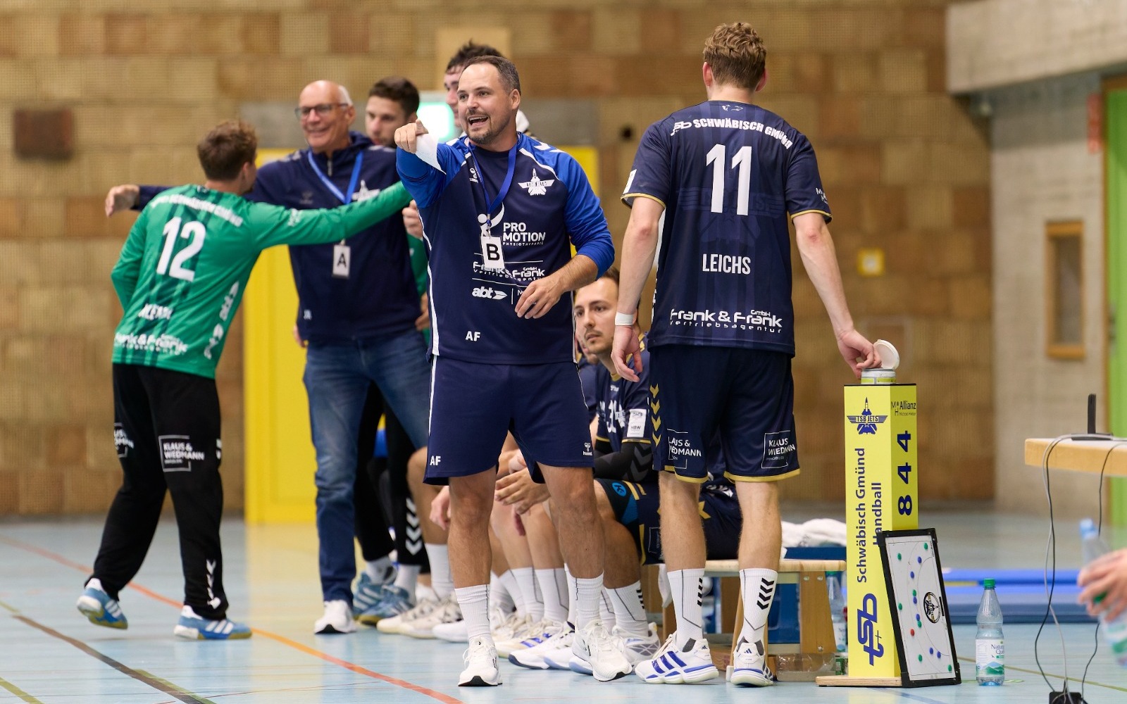 Was auf den Anpfiff folgte, glich einem Vulkanausbruch. Der TSB begann mutig – im Angriff ohne Torhüter, dafür mit zwei Kreisläufern – und führte schon nach acht Minuten mit 6:2. Defensiv überragten Christian Waibel und Andreas Maier im Mittelblock. Als Maier geschickt ein Stürmerfoul provozierte, wieder aufstand und seinen Kontrahenten jubelnd anbrüllte, war das eine Szene mit Symbolcharakter. Die Emotionalität stimmte, die Effizienz auch. „Das Gas drauf lassen“, so motivierte Maier die Nebenleute, während Niklas Burtsche den ersten von insgesamt sechs Siebenmetern sicher versenkte. Nach der ersten Zeitstrafe gegen die Gmünder wurde es auch zwischen den Trainerbänken hitzig. Echte Derbyatmosphäre, von der sich TSB-Rückhalt Daniel Mühleisen nicht beirren ließ und prompt den Strafwurf von Moritz Fink parierte.