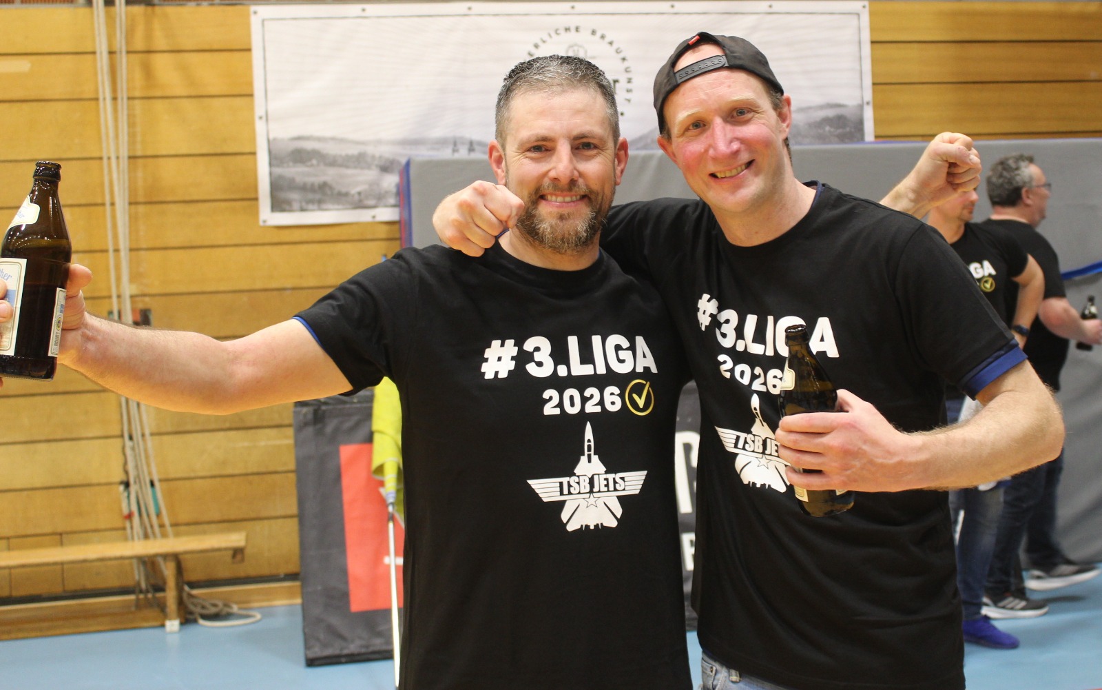 Als Andreas Maier den letzten Ball abblockte und die Zeit herunterlief, da sank Mitspieler Kai Schäffner erschöpft auf die Knie und wurde vom Wolfgang Bächle beinahe erdrückt. Im nächsten Momente stürmten die Jugendspieler des TSB Gmünd, die 60 Minuten lang an den Trommeln den Takt vorgegeben hatten, dazu. Wenig später verpasste sich das Kapitänsduo Bächle und Tom Abt gegenseitig die erste Bierdusche. Die Hofbühlhalle in Neuhausen wurde zum Startpunkt für eine zuvor nie dagewesene Party. Der 18. April 2026 ist ein Tag für die Geschichtsbücher des TSB Gmünd gewesen.