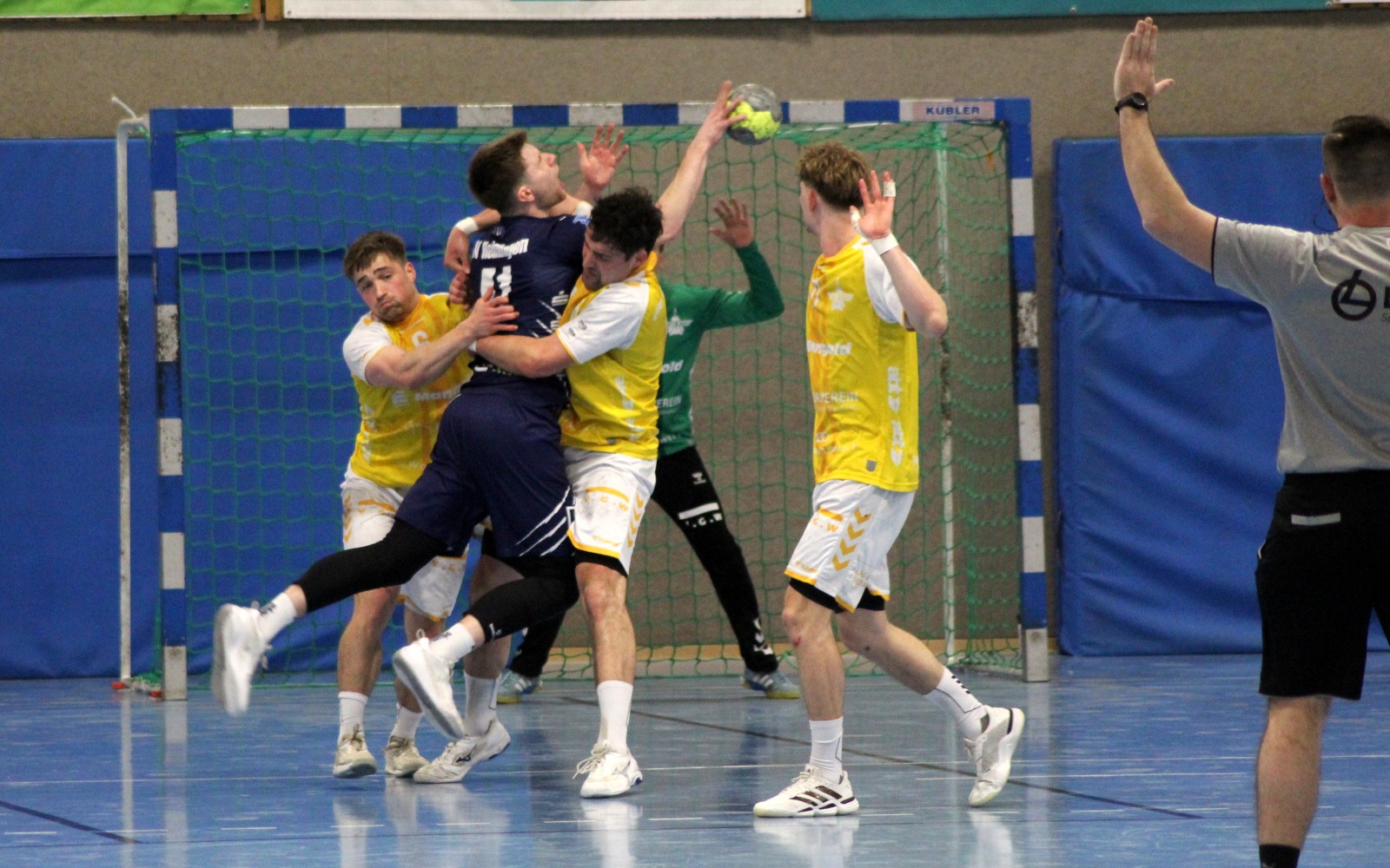 Nicht die einsetzende Rotation, sondern vielmehr die sich häufenden Fehlwürfe ließen das Derby kippen. Ein weiterer Knackpunkt: Direkt nachdem Burtsche mit einem frechen Lupfer zum 11:8 (20.) eingenetzt hatte, leistete sich der TSB einen Wechselfehler und stand 15 Sekunden später nach einem Foulspiel von Stephan Mühleisen mit zwei Akteuren weniger auf dem Feld. Um diesen Nachteil auszugleichen, ersetzten die Gmünder ihren Tormann durch einen zusätzlichen Angreifer, scheiterten aber immer wieder an Manuel Weinbuch. Der 36-jährige TSV-Rückhalt erzielte selbst mit einem Distanzwurf den 11:11-Ausgleich (22.). Von Außen verzweifelte Abele am Pfosten, sein Team geriet mit 13:15 (25.) ins Hintertreffen und die Halle tobte. Defensiv fand der TSB keine Mittel, kassierte sieben Gegentore innerhalb von nur sechs Minuten. Keeper Klemm konnte sich erst mit einem parierten Strafwurf einmal auszeichnen. Seine Vorderleute aber hatten in der ersten Halbzeit fünfmal Pech bei Aluminiumtreffern. Gekrönt von jener Szene, in der sowohl der freigespielte Kreisläufer Mühleisen als auch Burtsche im Nachwurf nur den Pfosten trafen.