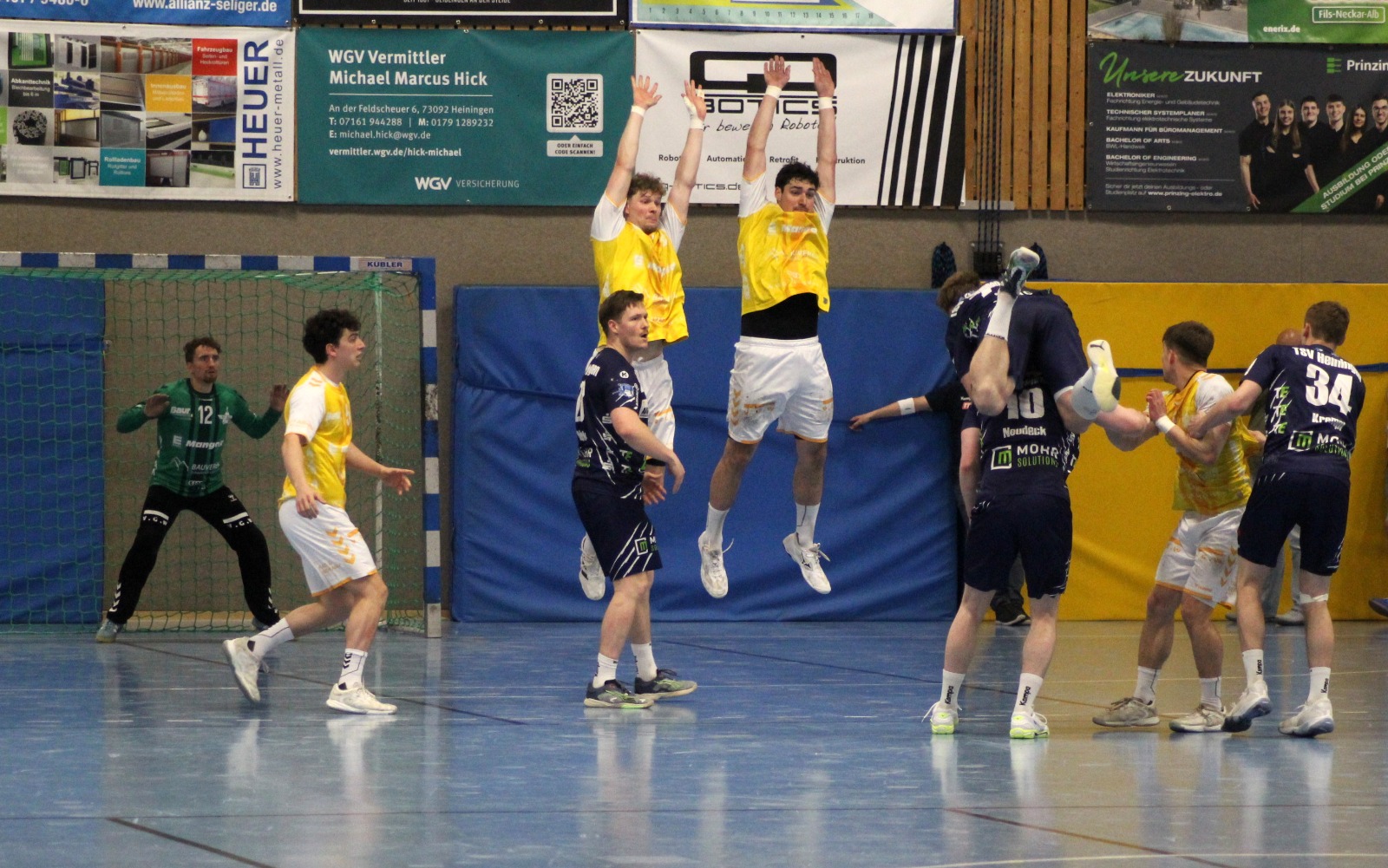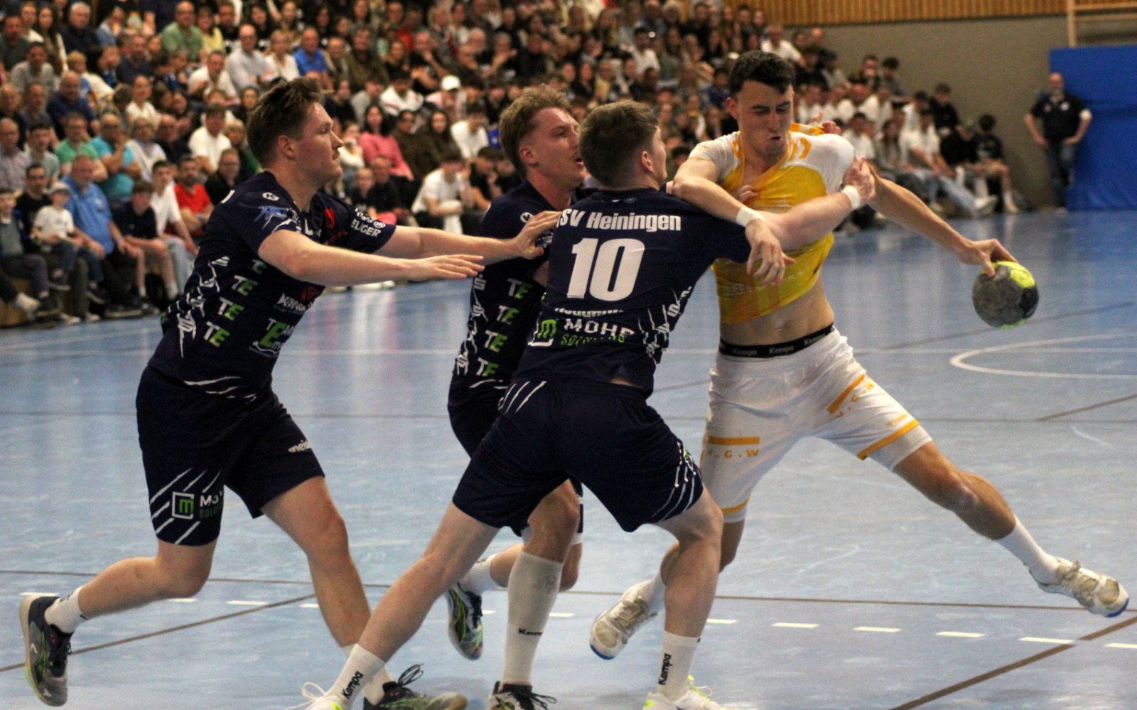 Nichtsdestotrotz war es ein prickelndes Derby, in dem keiner der 650 Zuschauer sein Kommen bereuen und auch der Meister sich keinen Vorwurf in puncto Einsatz gefallen lassen musste. Gleich zu Beginn setzte sich Kai Schäffner energisch durch und erzielte die ersten beiden Tore. Die Heininger glichen aber schnell aus, denn sie hatten die richtigen Lehren aus der 24:37-Hinspielschlappe gezogen. „Damals hatten wir keine Lösungen gegen die vier Rückraumspieler und das entsprechend aufgearbeitet“, erklärte TSV-Trainer Hagen Gunzenhauser: „Der andere Part war, dass wir uns gegen die starken Gmünder Abwehr nur einen kurzen Wackler geleistet und es sonst sehr fokussiert heruntergespielt haben.“