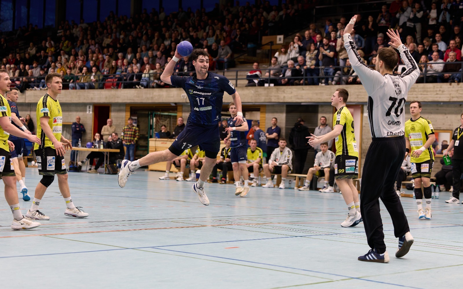 Die tolle Kulisse dient dafür als bestes Argument. Bereits im Online-Vorverkauf hatte der TSB über 300 Tickets abgesetzt, weitere 200 Fans fieberten im Online-Livestream mit. Auf der Tribüne der Großen Sporthalle waren nur wenige Außenplätze frei geblieben, in der Mitte drängten sich die Leute sogar auf den Treppen und hinter dem Tor tummelten sich die Jugendspieler an den Trommeln. "Genau dafür lebt man als Handballer, saugt das auf und zieht Energie heraus", freute sich Schäffner. Die Menge so richtig zum Toben brachte Linksaußen Niklas Burtsche mit seinen herausragenden 13 Toren: "Für mich war es das erste Spiel vor so einer vollen Halle, die zum Hexenkessel geworden ist. Das konnten wir mit unserer guten Leistung krönen."Nach 40 Minuten überwiegen Qualität und Routine der Gäste