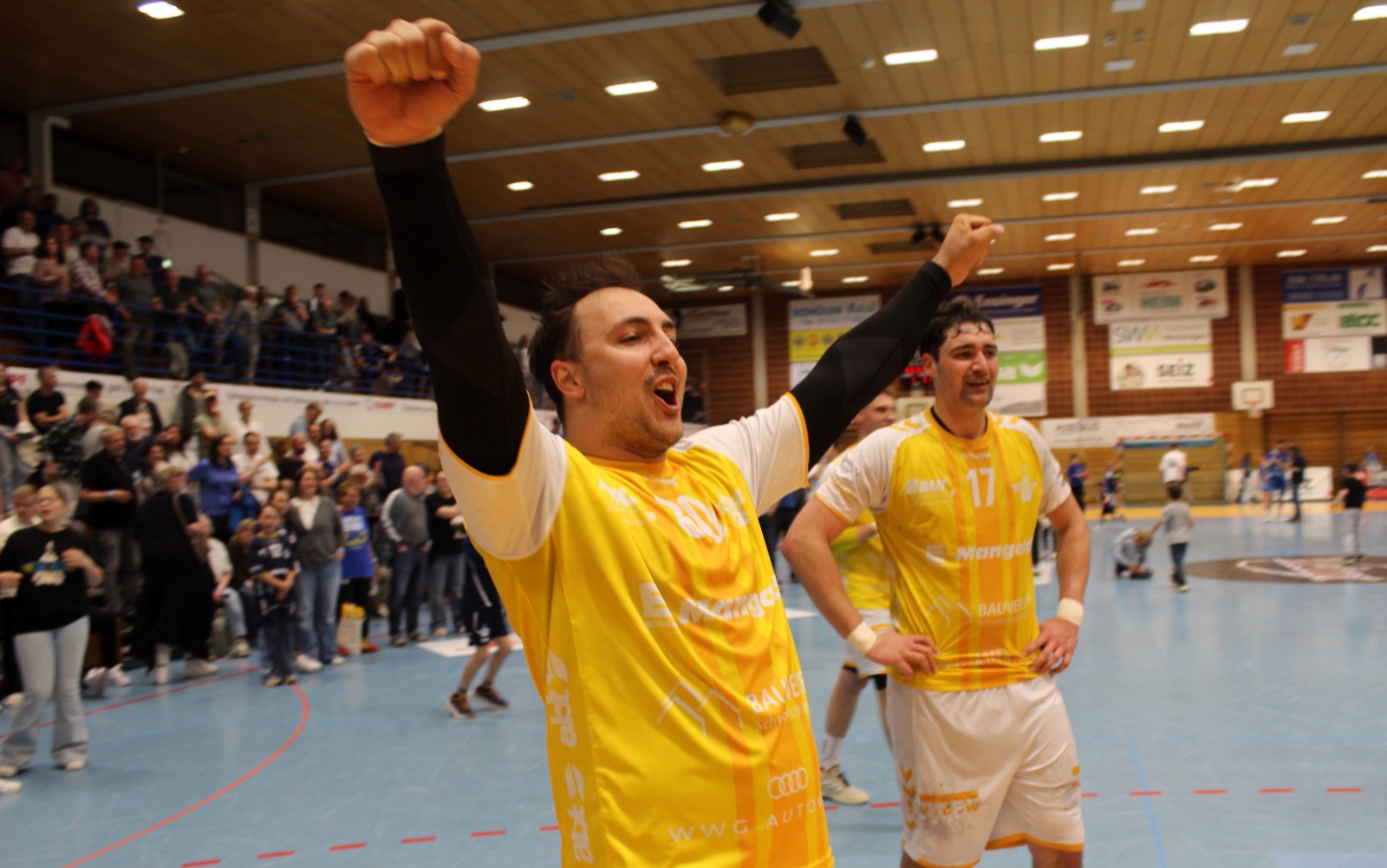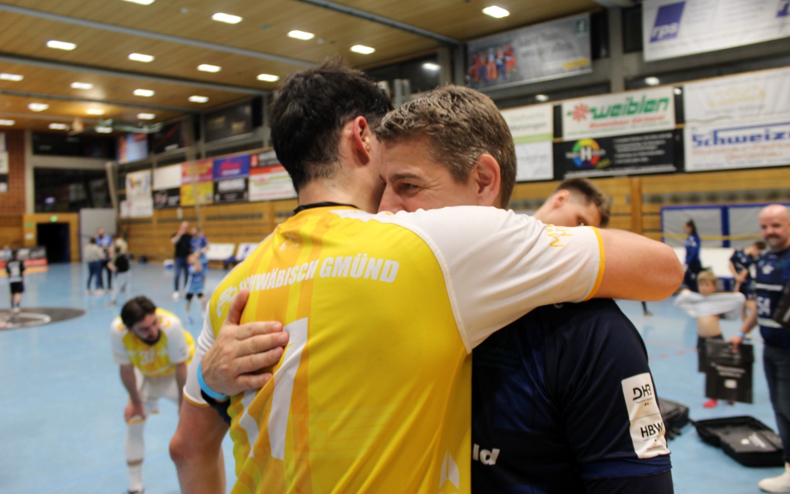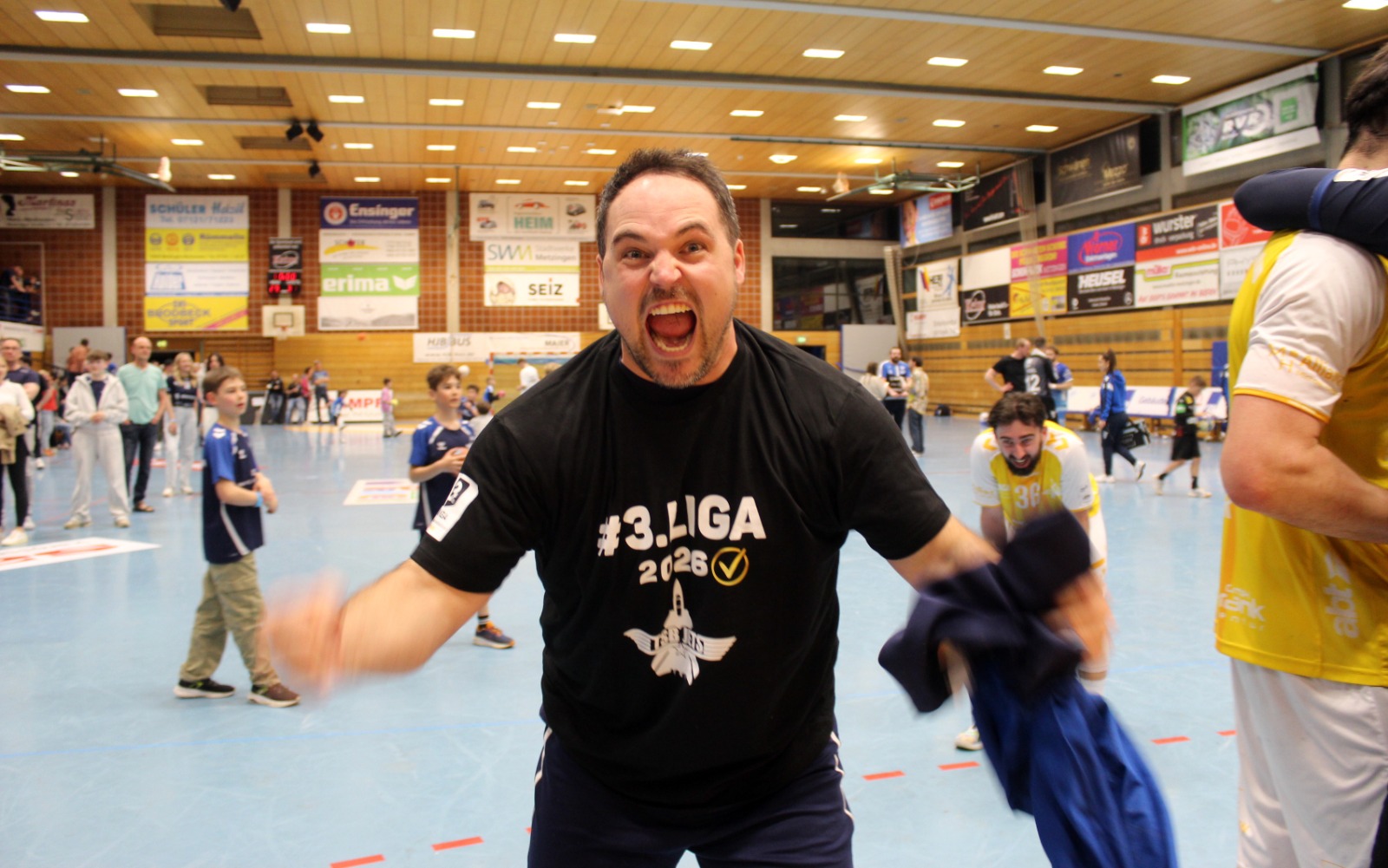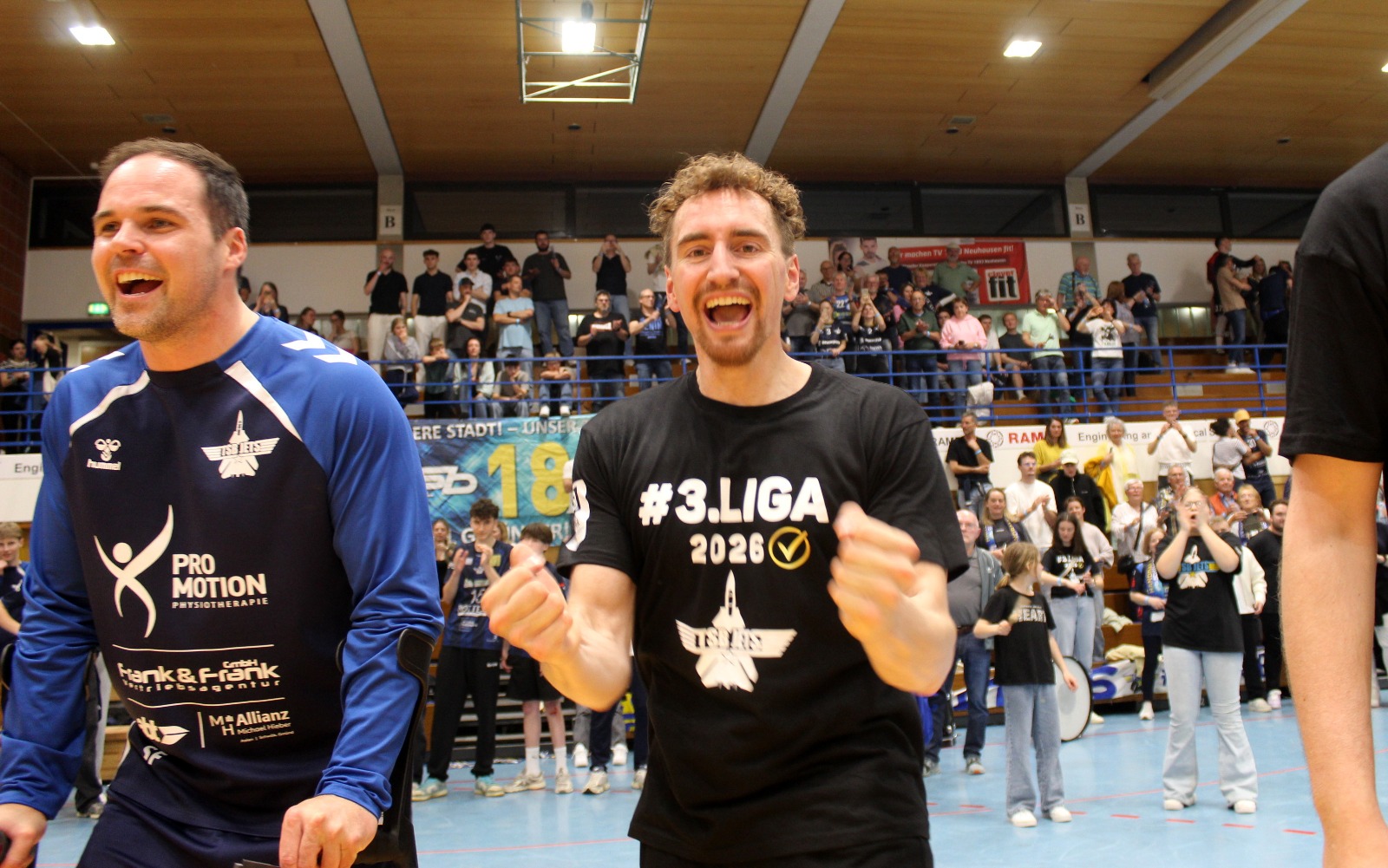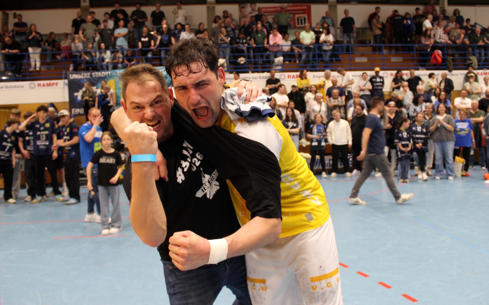 Als Andreas Maier den letzten Ball abblockte und die Zeit herunterlief, da sank Mitspieler Kai Schäffner erschöpft auf die Knie und wurde vom Wolfgang Bächle beinahe erdrückt. Im nächsten Momente stürmten die Jugendspieler des TSB Gmünd, die 60 Minuten lang an den Trommeln den Takt vorgegeben hatten, dazu. Wenig später verpasste sich das Kapitänsduo Bächle und Tom Abt gegenseitig die erste Bierdusche. Die Hofbühlhalle in Neuhausen wurde zum Startpunkt für eine zuvor nie dagewesene Party. Der 18. April 2026 ist ein Tag für die Geschichtsbücher des TSB Gmünd gewesen.